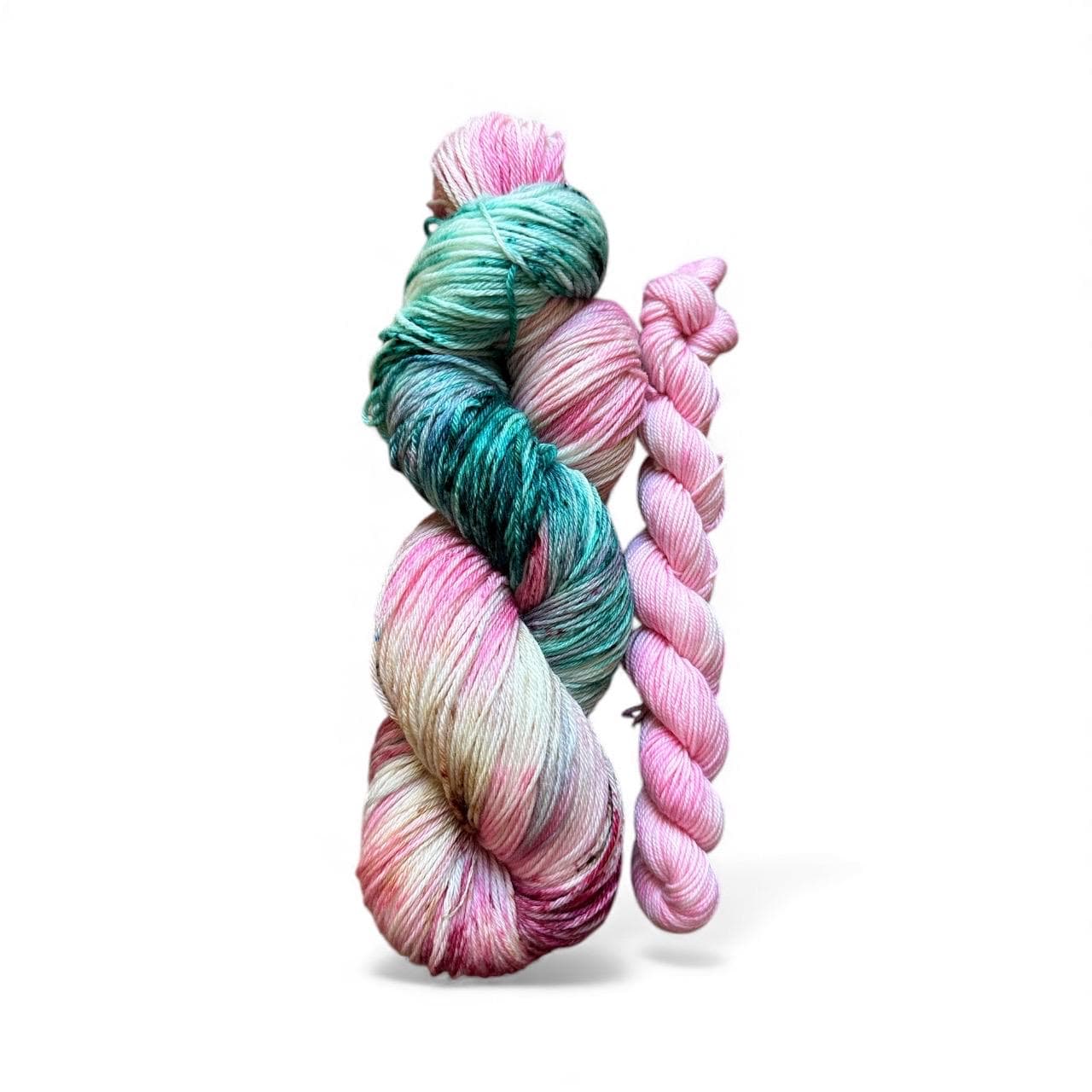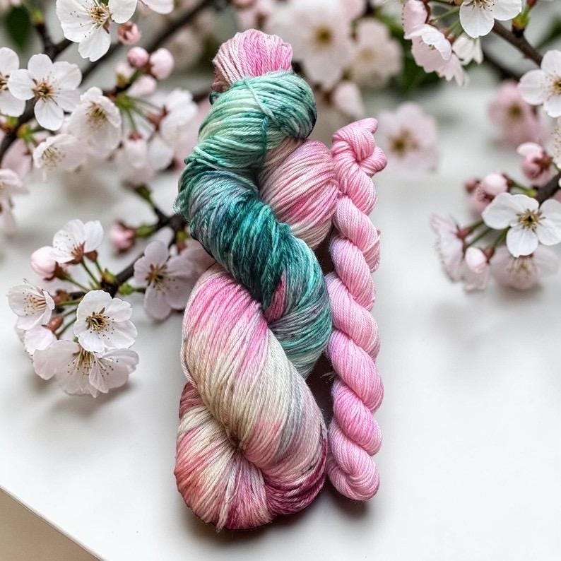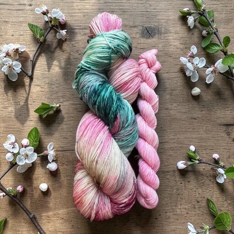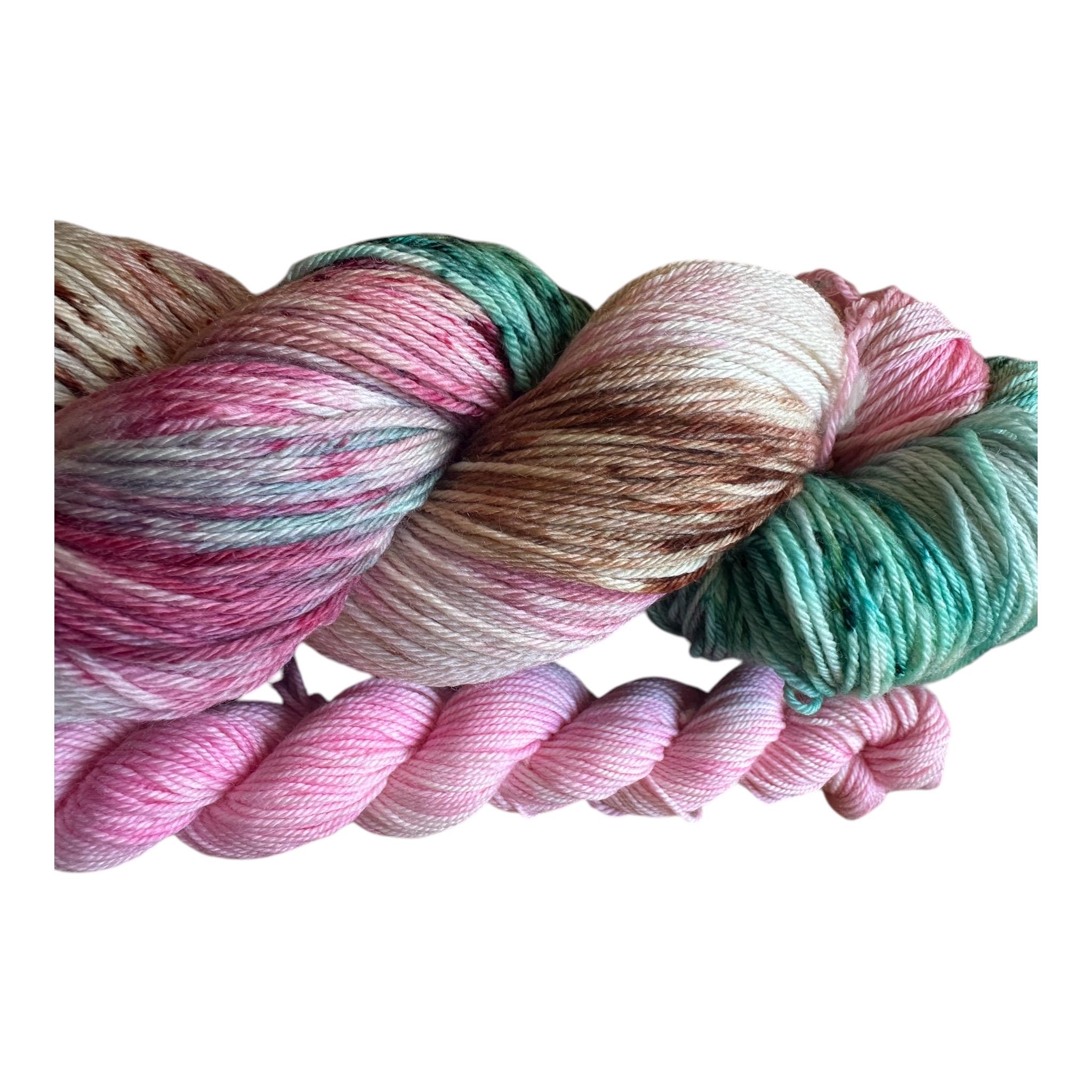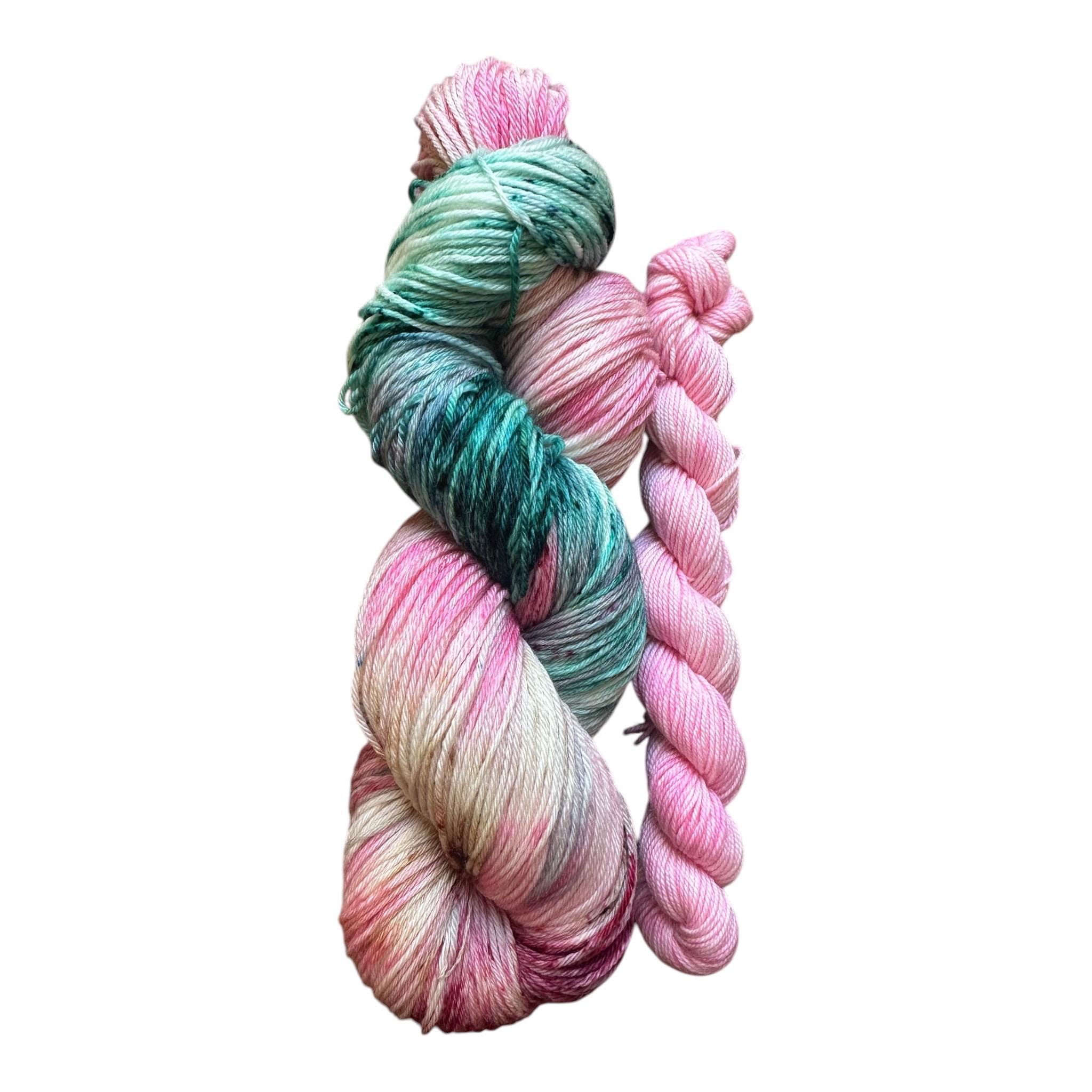 “Ethereal Bloom” is a soft pink speckled with green, vermillion and tan . This sock set comes paired with the matching pink minnie 20g skein.
