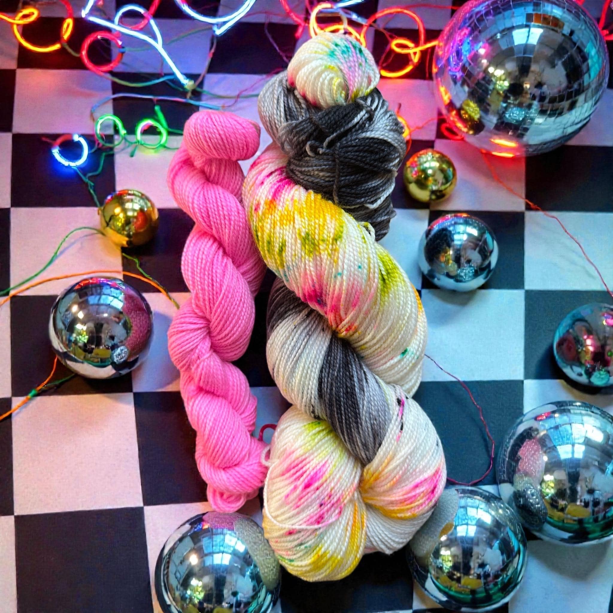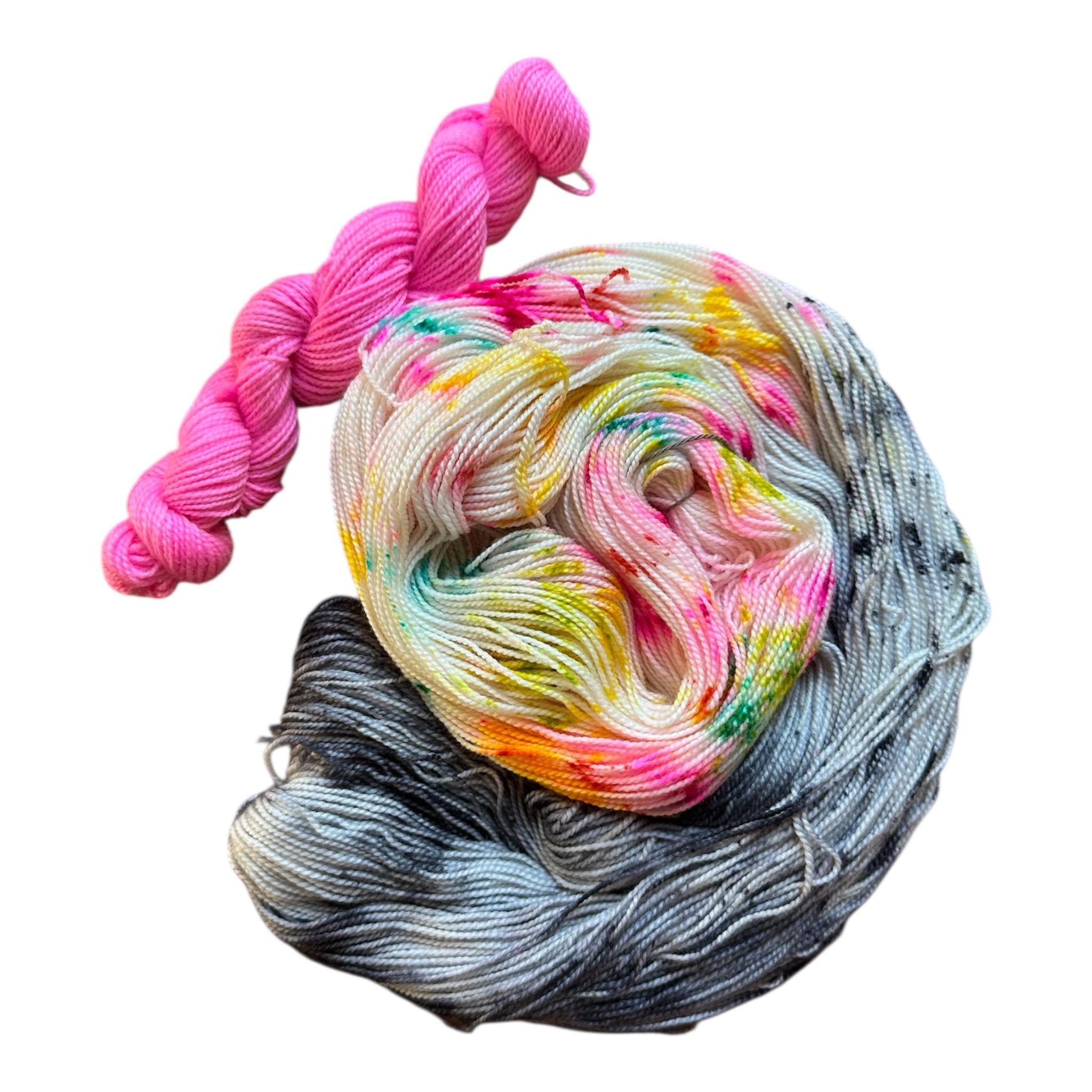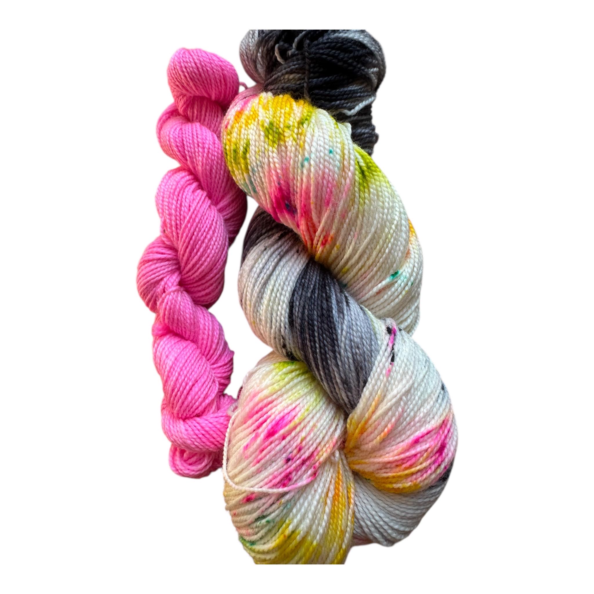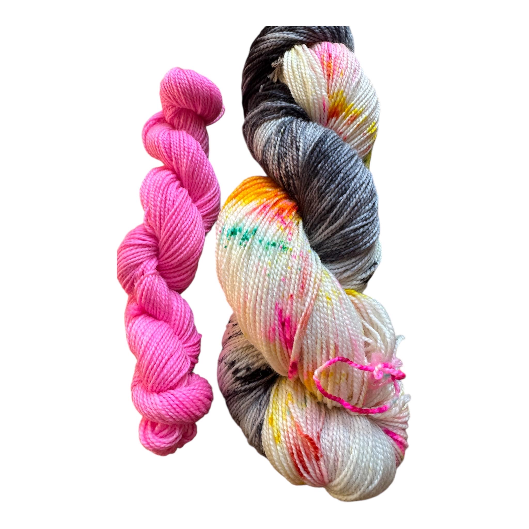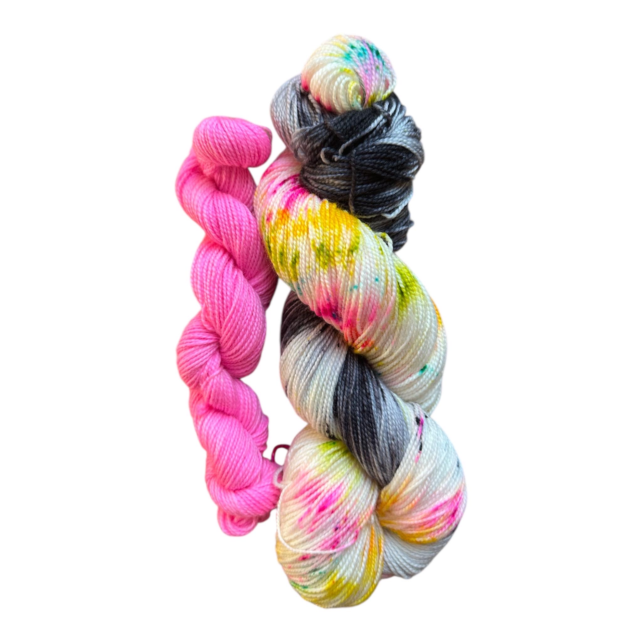 Late Eighties Party is speckled with neon pink, yello, orange green and with a gray and speckled black loop . This set comes paired with the matching pink minnie 20g skein.