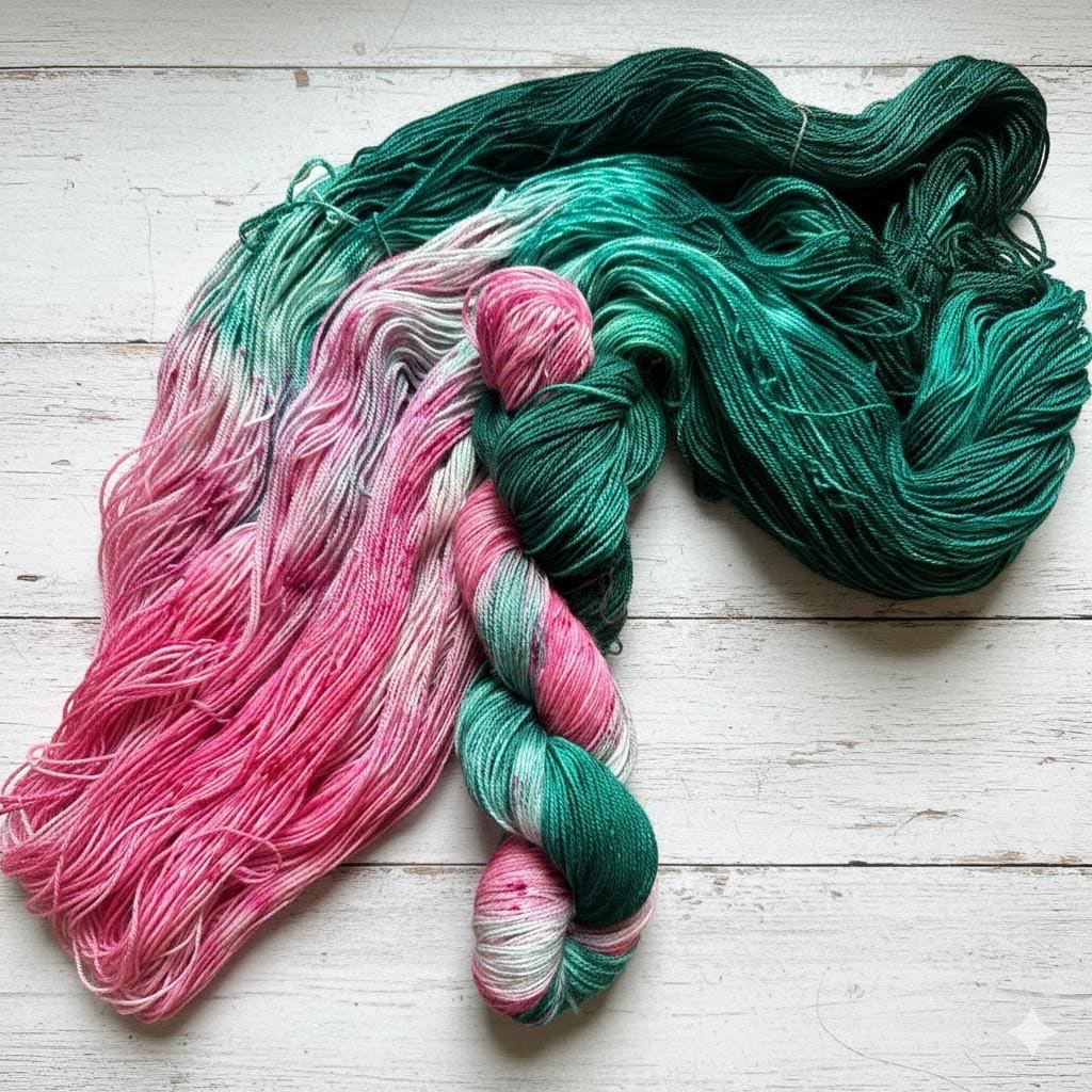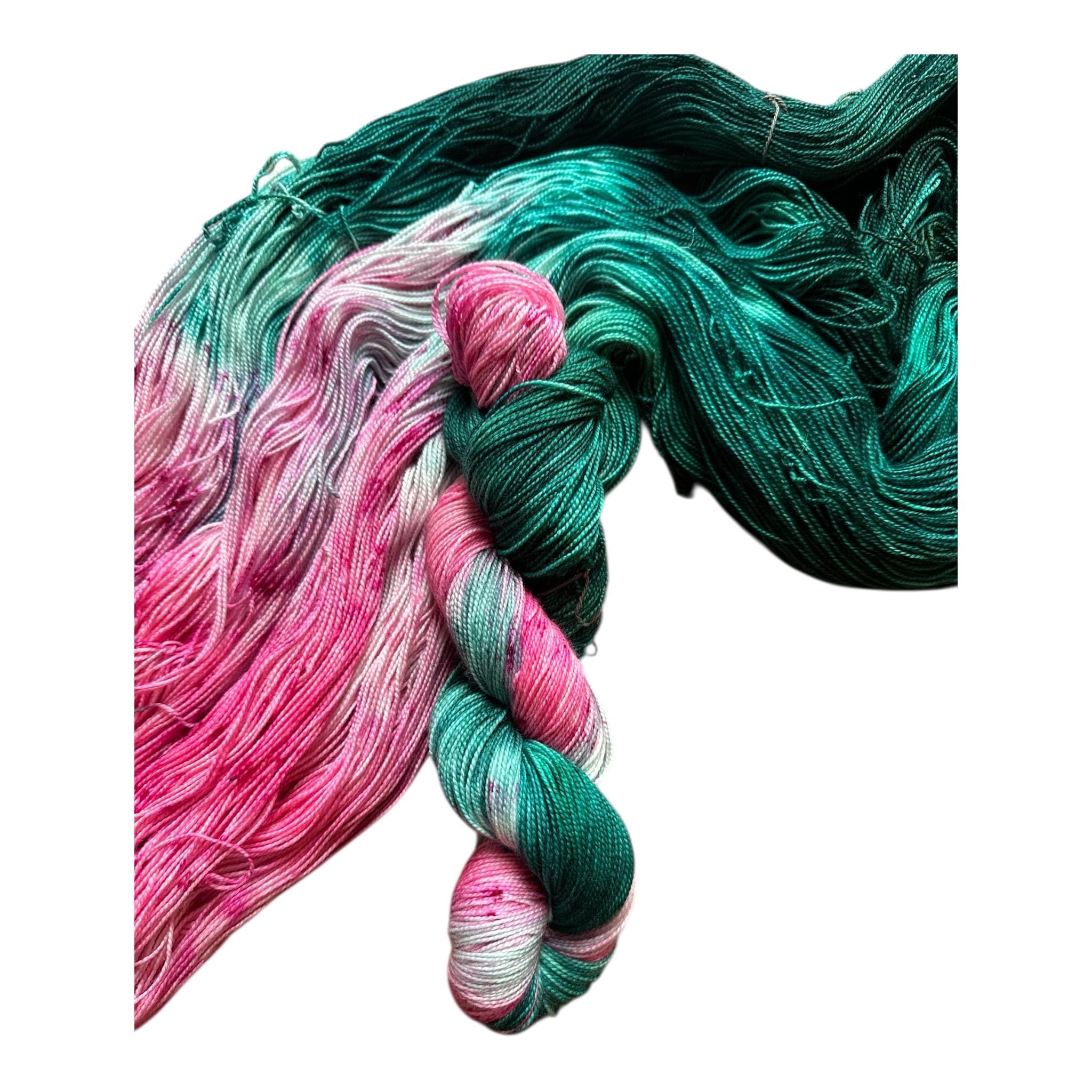 Each skein is artistically hand dyed by me in small batches, using high quality, super soft merino yarns, and acid dyes. Because of this, each skein is a unique blend. The use of colorways as tonal, variegated or semi solid lends itself beautifully and uniquely to shawls, sweaters, hats, mittens and socks.