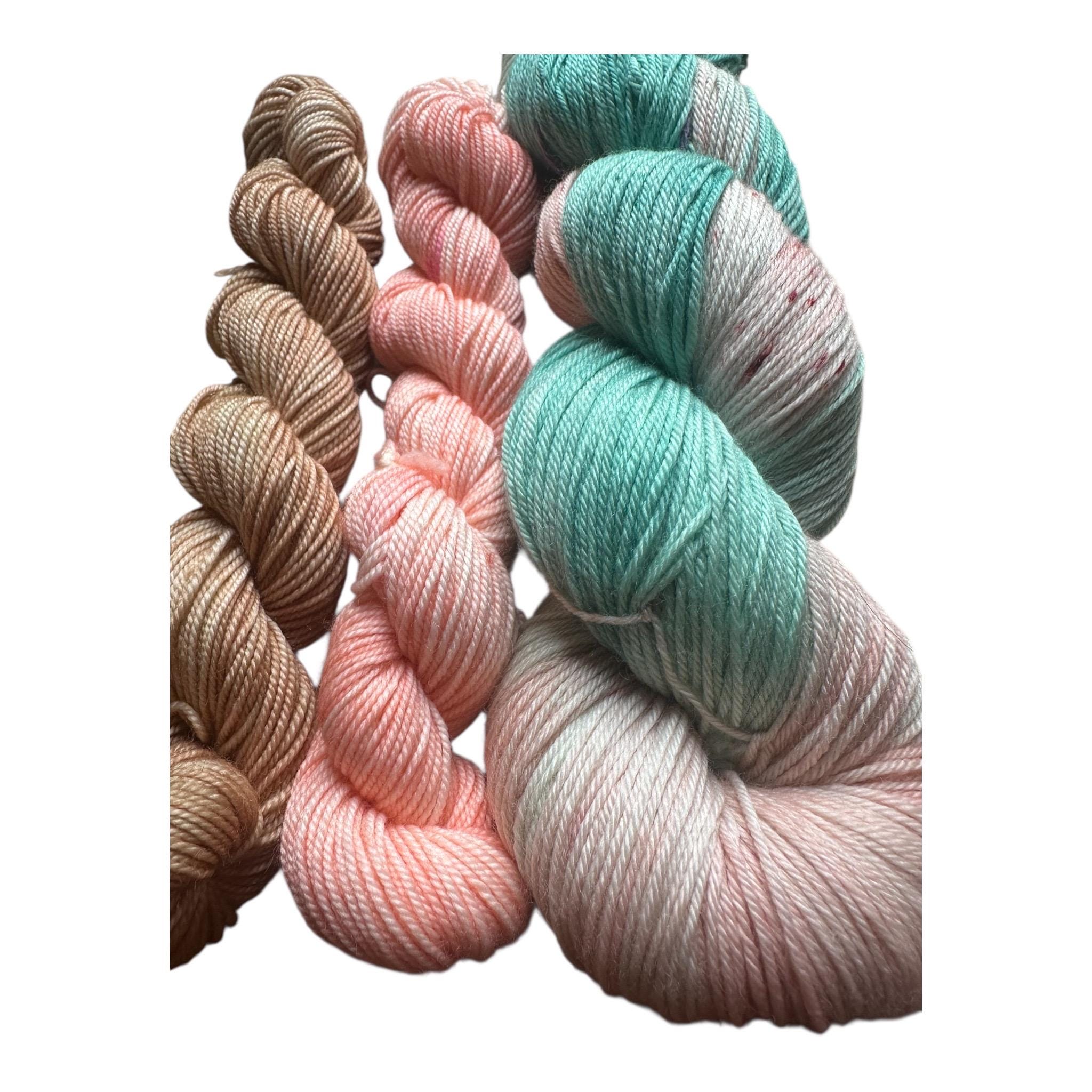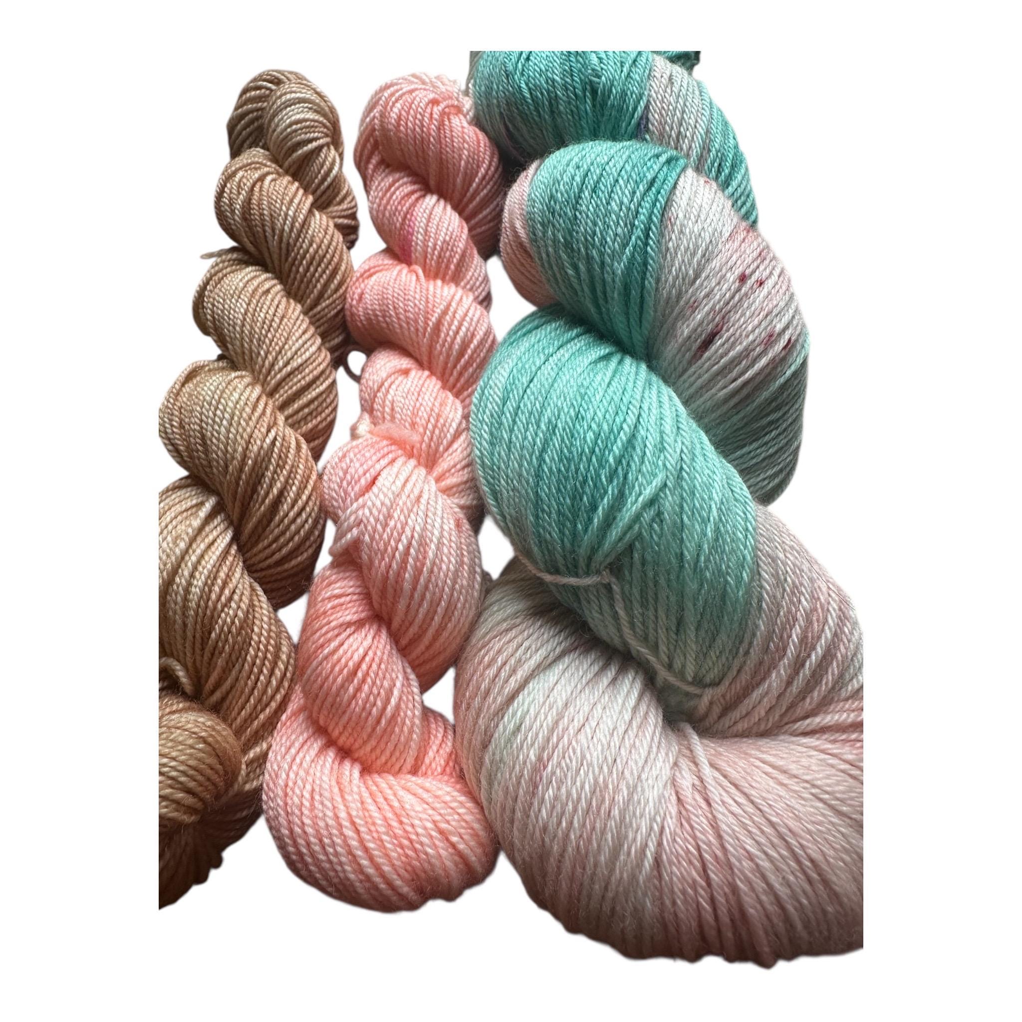 Hand Dyed Merino Wool 3 piece Yarn Set: Fingering sock wool yarn, peach, green, speckled pastel